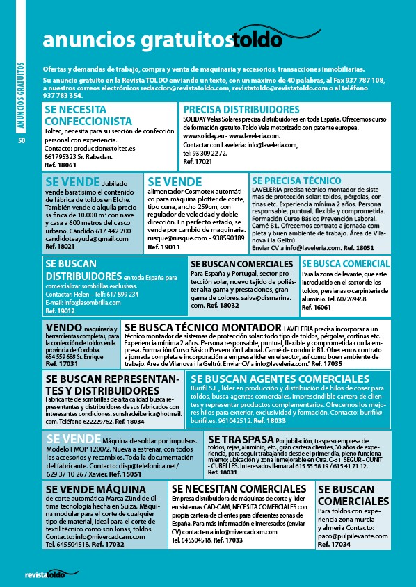 Su anuncio gratuito en la Revista TOLDO enviando un texto, con un máximo de 40 palabras, al Fax 937 787 108,